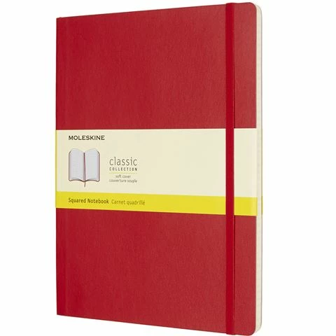 Create graphs, scaled drawings and more, with Moleskine’s Classic Soft Cover Squared Notebook Scarlet Red XL. With a soft, scarlet red cover, this notebook has 192 squared pages. This notebook features the history of Moleskine inside, an expandable inner pocket, an elastic closure, and a ribbon bookmark.